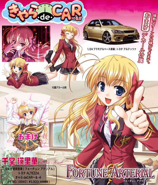 フジミ模型より「キャラdeCAR〜る」シリーズ第四弾として「FORTUNE ARTERIAL」千堂瑛里華アルテッツアが発売されます。1/24スケールトヨタ・アルテッツアに専用設計されたFORTUNE ARTERIAL 千堂瑛里華のデカールが付属します。