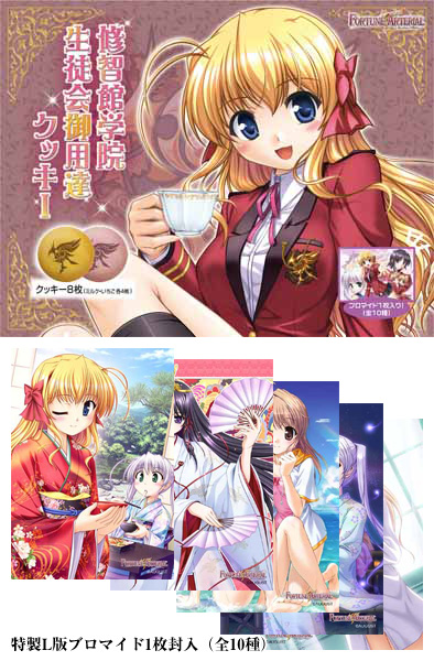 ブロッコリーより「FORTUNE ARTERIAL」のシンボルをモチーフにした「FORTUNE ARTERIAL 修智館学院生徒会御用達クッキー」が発売されます。特製L版ブロマイド1枚が封入されています(全10種類からランダムで1枚封入)